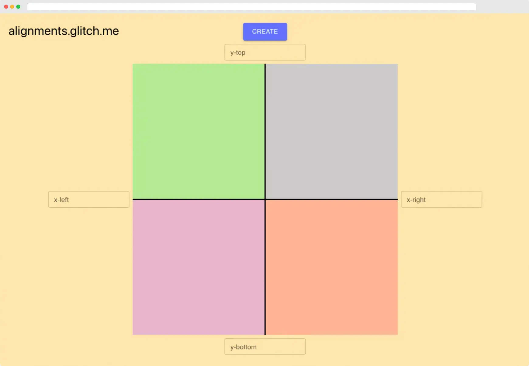 During school, my friends and I would constantly make these silly alignment charts where we would create coordinate planes labelling the x and y axes things like extrovert/introvert + vampire/werewolf and then place ourselves somewhere along this plane. Now that we've graduated, I decided to make this alignment chart creator so we could continue sending them to each other for the lols.
